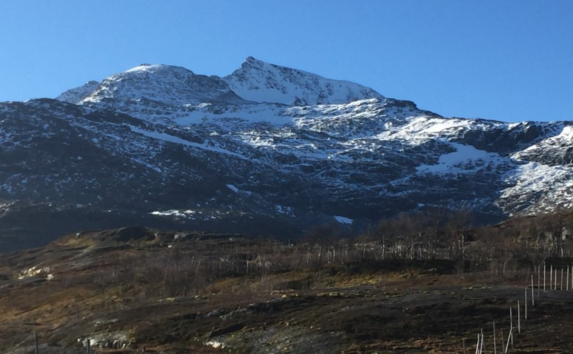 Da vi hadde passert Ridaren kom vi til reingjerdet. Her fikk vi fin utsikt til Nord Norges høyeste fjell, Oksskolten. Vi fikk også se rein noe som førte til en ny runde med gira hunder og en motvillig eier lett joggende på slep.