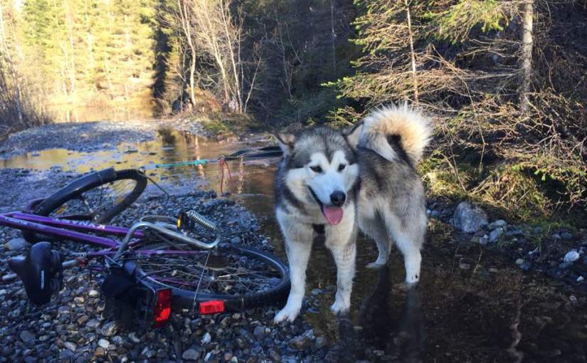 Jeg har syklet med Nuuk tidligere. Da har jeg hatt han foran meg, men med Dakota var jeg mer usikker siden hun surrer mye frem og tilbake når vi går. Plutselig kan hun stoppe, og det er ikke enkelt når du har stor fart på sykkel. Jeg bestemte med derfor for et sykkelfeste på siden av sykkelen for våre første sykkelturer. Festet har en mekanisme som skal løsne om bevegelsen fra Dakota blir for brå. I tillegg kan Dakota løpe ved siden av veien som gjerne har et bedre underlag for henne enn asfalt.