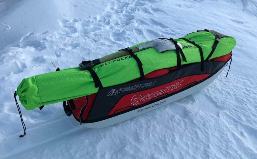 Det var kanskje egentlig ikke nødvendig, men det endte med at vi kjøpte mye nytt utstyr mens vi forberedte turen. Noe av det siste vi investerte i var enda et telt. Vi hadde tenkt at vi skulle bruke vårt velbrukte, Svalbard 6 camp, men etter at vi hadde prøvepakket pulkene fant vi ut at teltet var litt stort og tungt for 2 personer på en så lang tur. Det endte derfor med en tur til butikken, og vipps så hadde vi handla et nytt Fjellheimen X-trem 3. I tillegg kjøpte vi en pose for å oppbevare teltet med teltstengene i. Posen er avbildet ferdig pakket på pulken på det øverste bildet.