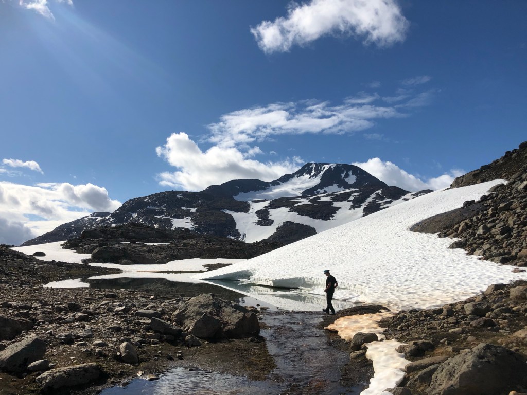 Skiftende vær var også noe vi var forberdt på. Erfaringen er at på Okstindene skifter det fort. Jeg hadde pakket både vinter, høst og sommerklær i sekken. Etter at vi hadde passert det første partiet gjennom fjellskogen kom vi opp til Austisen (en del av Okstindbreen), og fikk et vel fortjent nydelig skue mot dagens utfordring.