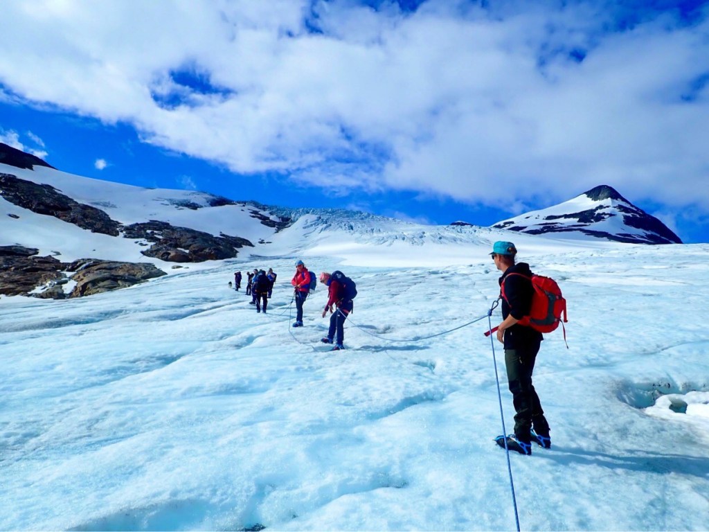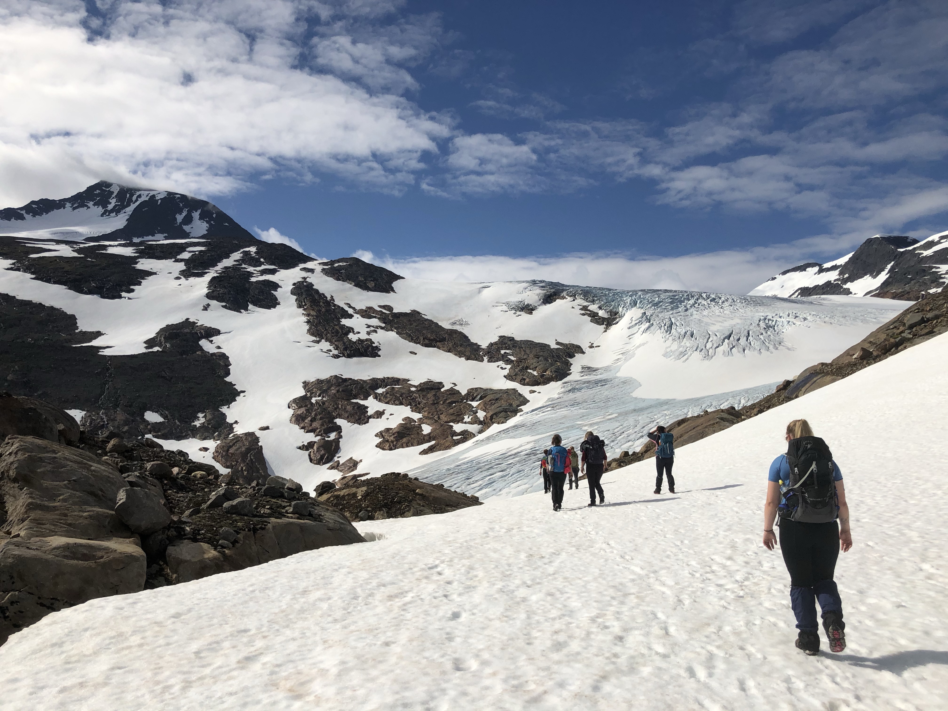 Etter en god pause på toppen gikk turen trygt og sikkert ned. Vi gikk i samlet tropp over breen og brukte totalt 10 timer på turen. GPSen min viste 16 km, og vi gikk opp 1400 høydemeter.