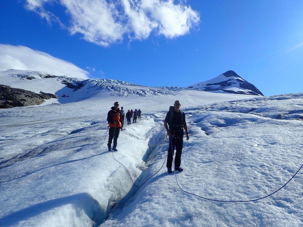 Det var litt strekk i laget, men vi brukte ikke mer enn en time opp til breen. Der tok vi på oss breutstyr. Det lå mye snø på breen så vi fikk ikke sett alle de spektakulære bresprekkene, men fordelene var at det var enkelt å krysse.