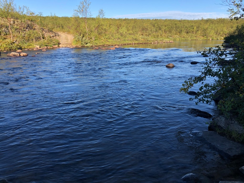 Vi hadde ikke gått langt før vi måtte krysse Ragesjohka. Det var ikke bare vi som hadde forbedret våre ferdigheter på elvekryssinger. Både Nuuk og Dakota svømte over Ragesjohka med kløven på. Dakota først, hun drev et stykke ned før hun kom i land, men var kjempe stolt da hun klarte det.