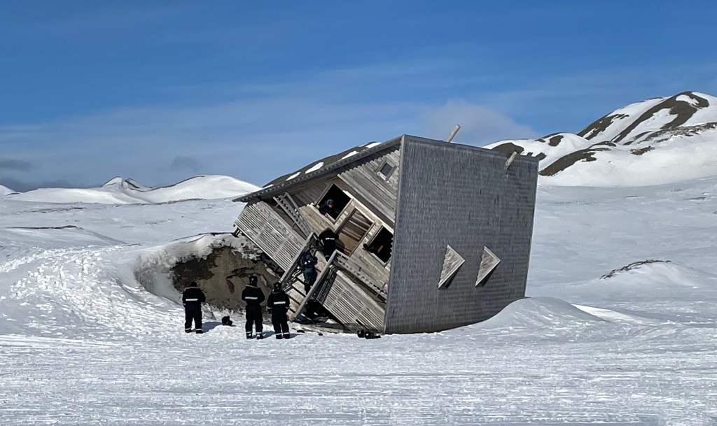 Bildet over viser en russisk hytte som havna på skråplanet etter en varm sommer.