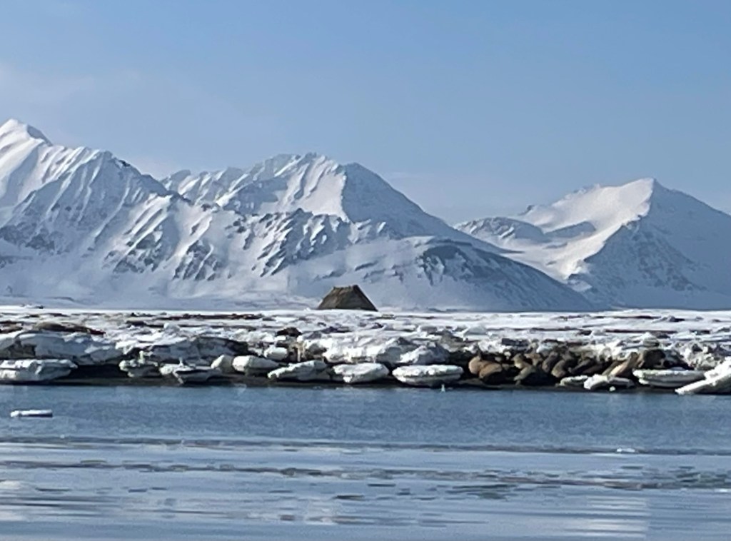 På Prins Karl Forland øya på Dawespynten traff vi på hvalrossen igjen. De velta seg dovent rundt og solt seg i vannkanten.