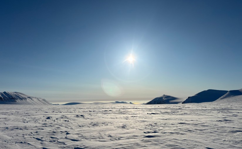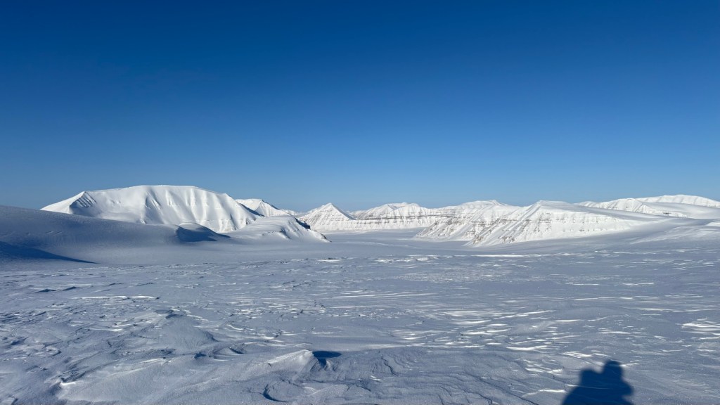 Etter flere dager med oppoverbakker kunne vi nyte litt slakere terreng over Filchnerfonna. Enkelte plasser var det noen harde «snøbårer» som måtte forseres ellers var det bra. Jeg koste meg bakerst sammen med Rago.
