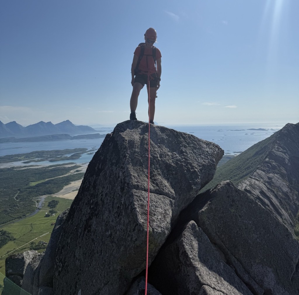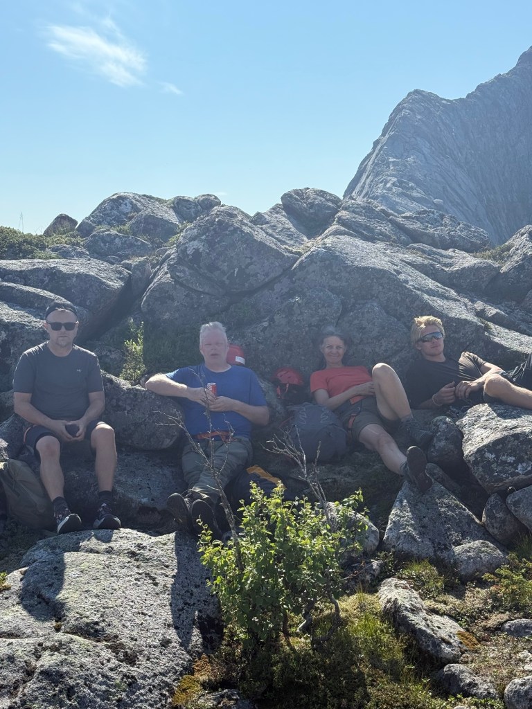 På toppen av Sørskottinden 608 moh fikk vi lønn for strevet. Der hadde vi utsikt til både Lofotveggen og til de flotte Skotstindan.