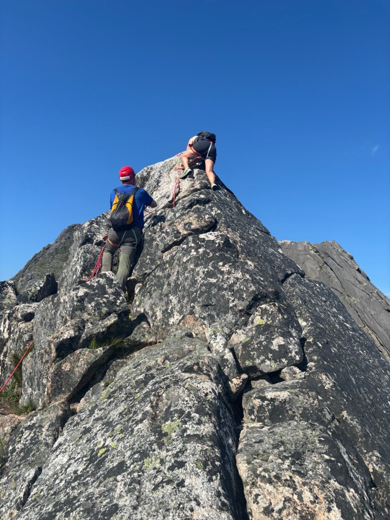 Omtrent 100 høydemeter under toppen møtte vi Øvrebreen. Her ble det luftig, og noen valgte å stoppe. Vi øvrige ble knytt inn i tau før vi fortsatte mot toppen – noen glade og forventningsfulle mens andre følte mer skrekkblandet fryd.