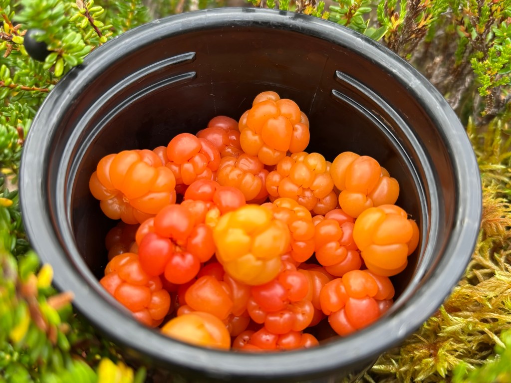På vei ned tok vi oss tid til å plukke de siste multebærene for sesongen, som vi fant på små berghyller rundt toppen. For dere som har fulgt bloggen min, vet at jeg er håpløs når det gjelder å gå forbi fine multebær – de må bare plukkes.
