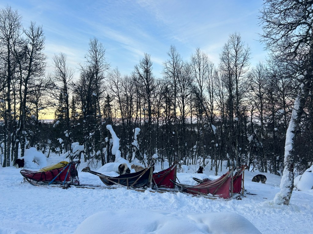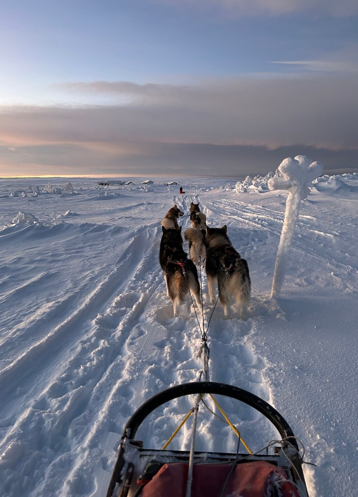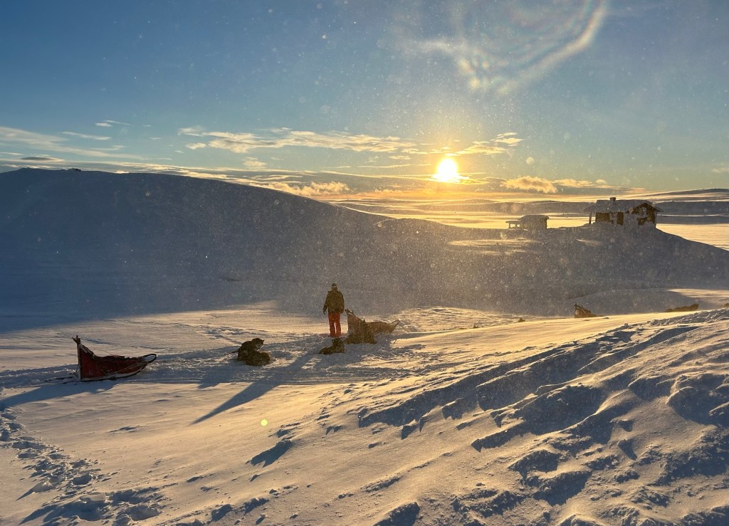Da både to og firebente hadde fått mat og drikke, hytta var vasket og vedkassen fylt opp, pakket vi sledene og lot hundene starte.