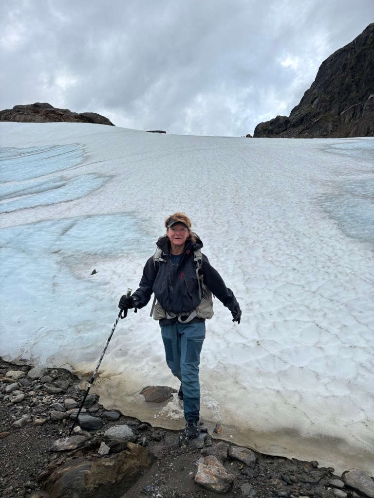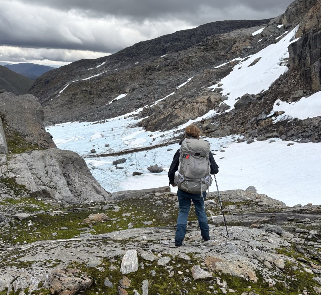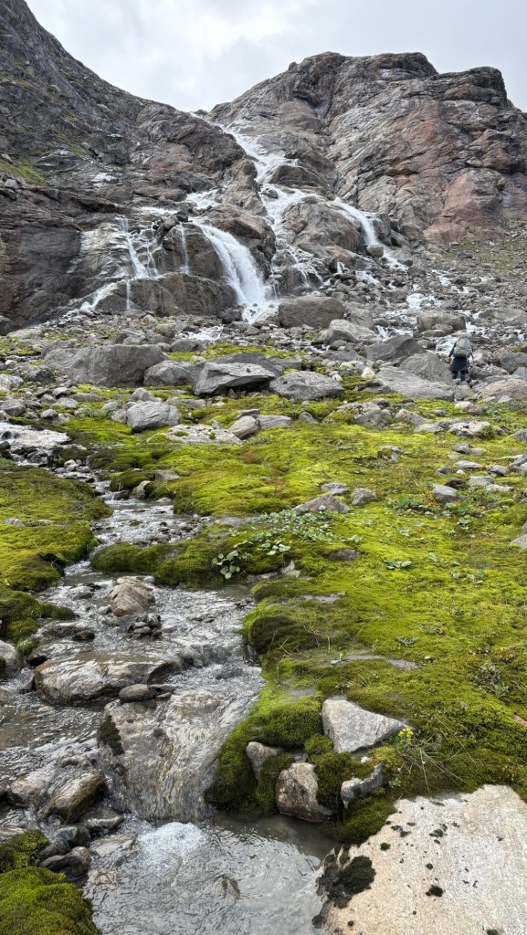 Vi burde hatt med stegjern, men etter litt frem og tilbake fant vi heldigvis en trygg vei over breen. Igjen ble vi slått av hvor rått og vakkert landskapet var.