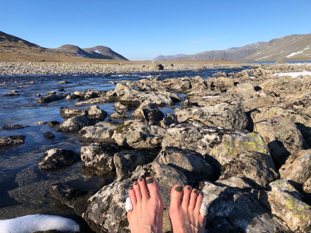 Det var bedre temperatur på kvelden, men ikke kaldere enn at sola fortsatt fort tørka opp våte føtter etter vading.