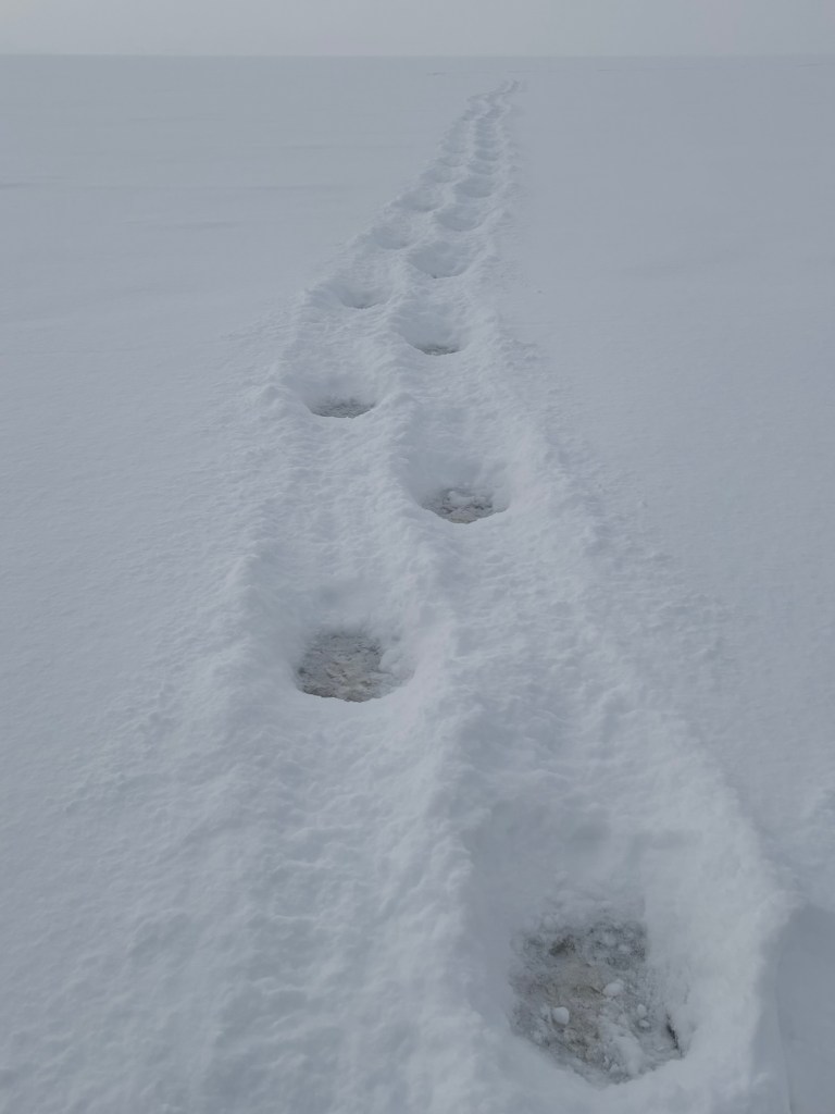 Det snødde fortsatt og var dårlig sikt da vi startet over Isbukta. Vi gikk på sjøisen og så ikke noe. Jeg var litt redd for at det plutselig skulle dukke opp en isbjørn i den dårlige sikten, så jeg fant frem signalpistolen min i tilfelle det skulle skje. Morten, vår erfarende guide, hadde et mer avslappet forhold til oppdukkende isbjørner. Han mente de var langt ute på isen på jakt etter sel på denne tiden av året. Jeg var ikke helt overbevist og var glad jeg hadde både hund og signalpistol.