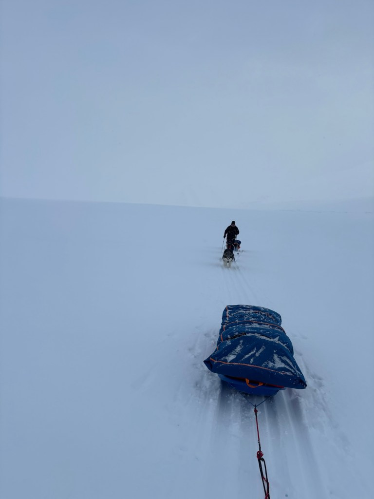 Det var klarere og kaldere da vi våknet. Vi lastet minimalistisk i hundepulken, og det var lurt. Det var fortsatt ganske tungt føre for hundene, men det gikk likevel bedre enn dagen før. Og etterhvert som vi kom lenger opp på Nathorstbreen ble det også hardere forhold og bedre for hundene.