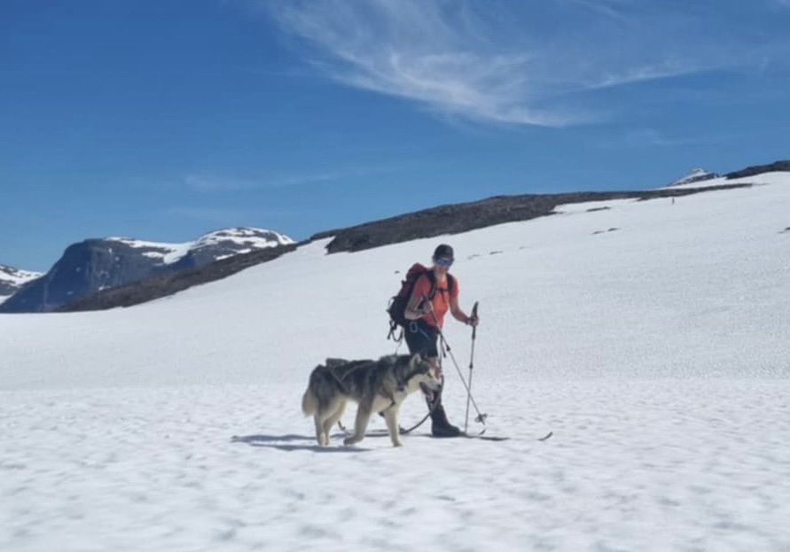 Vi gikk fra den øverste parkeringsplassen øverst i Leirskadalen i midten av juli. Skiene ble festet til sekken og slik bar vi de opp til Rabothytta.
