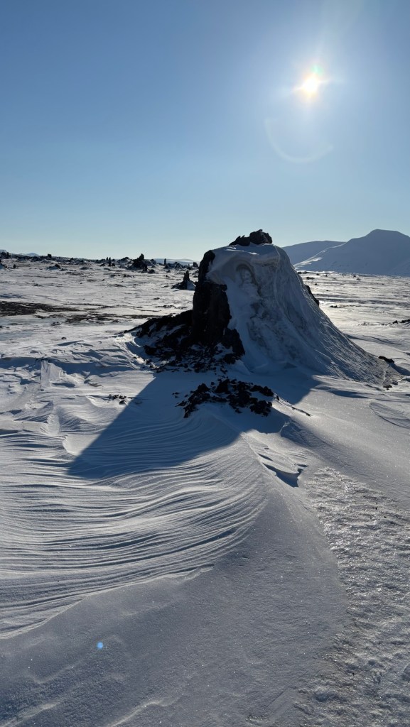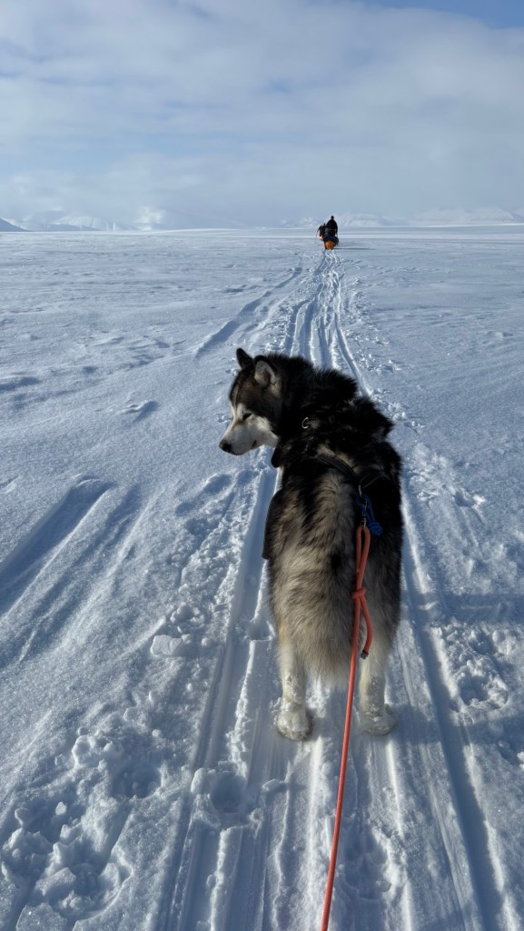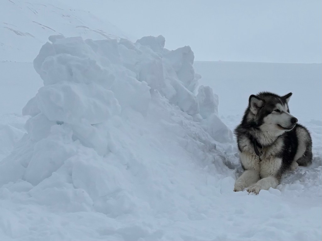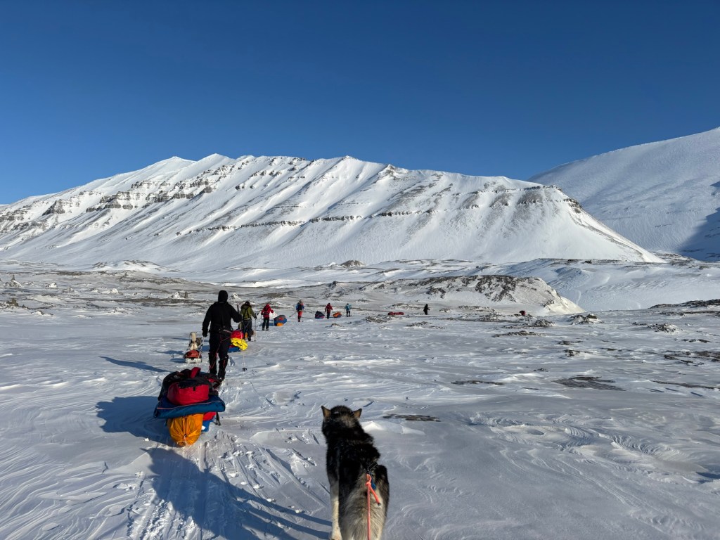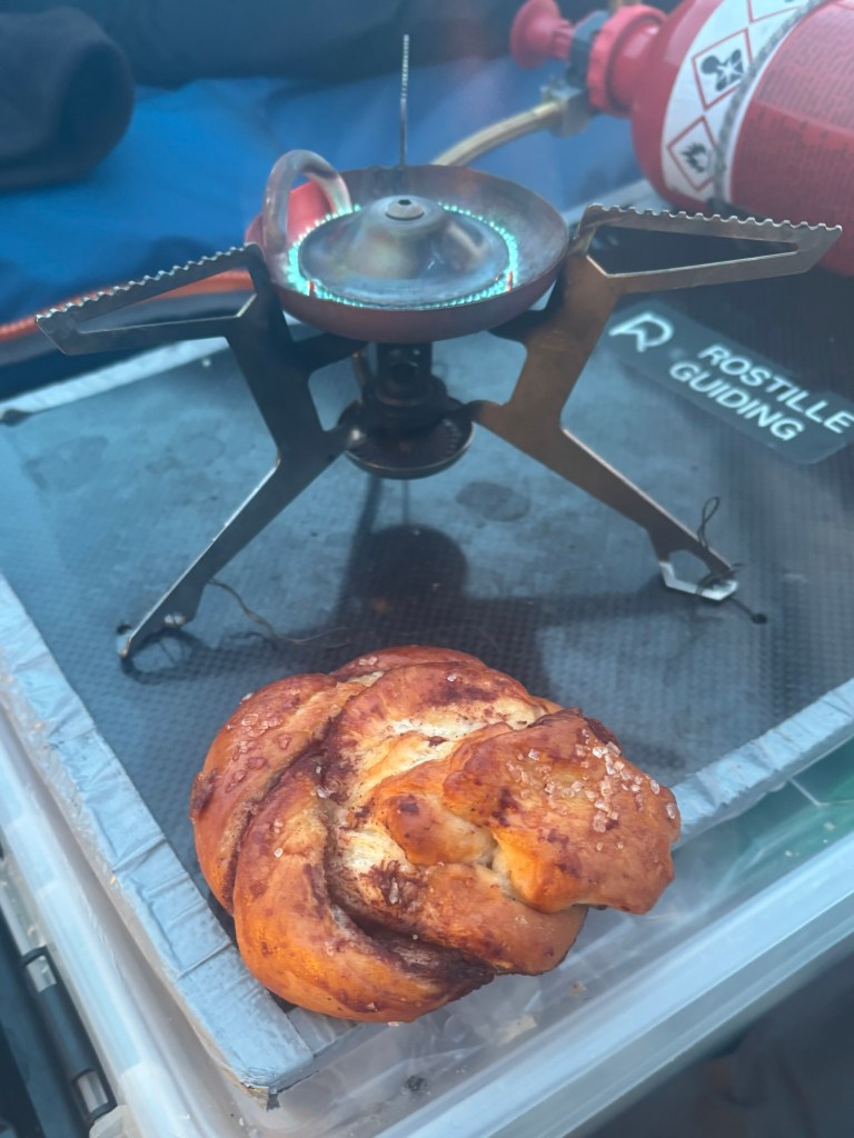 På ettermiddagen fikk vi hyggelig besøk fra Longyearbyen av vår sønn, Birk, og ikke mindre enn tre guider fra Svalbard Adventures. De hadde med seg nybakte kanelsnurrer og godbiter til hundene. Kanelsnurrene ble meget godt mottatt av sultne skigåere. De smakte himmelsk.