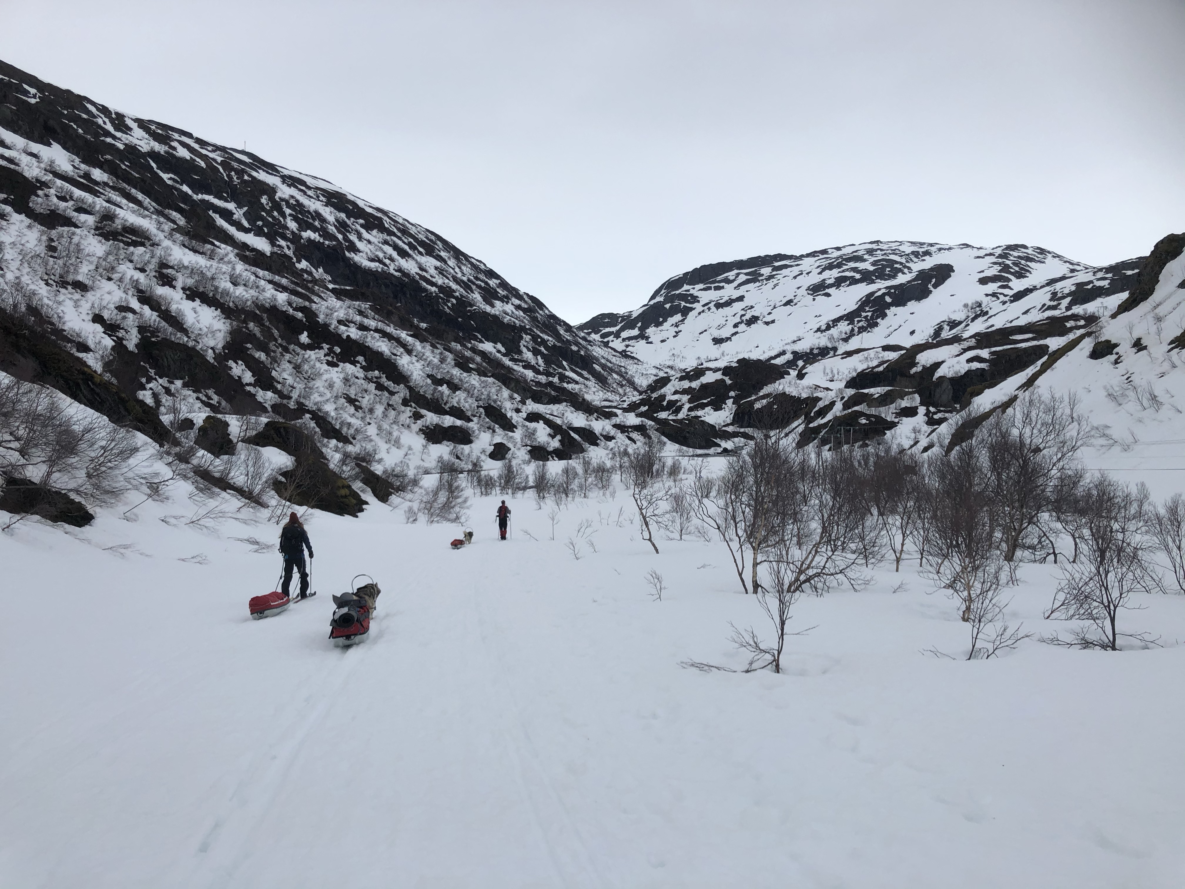 Hundenes lek inspirerte oss, og vi bestemte oss for å overta pulkene og satte utfor. Jo lengre vi kom ned jo dårligere føre. Snøen var våt og tung og pulken lå som et anker bak mens sola stekte i nakken. Nede i dalen var det en liten flokk med rein. Heldigvis fikk jeg samlet sammen hundene før de oppdaget hva som var fremfor oss.