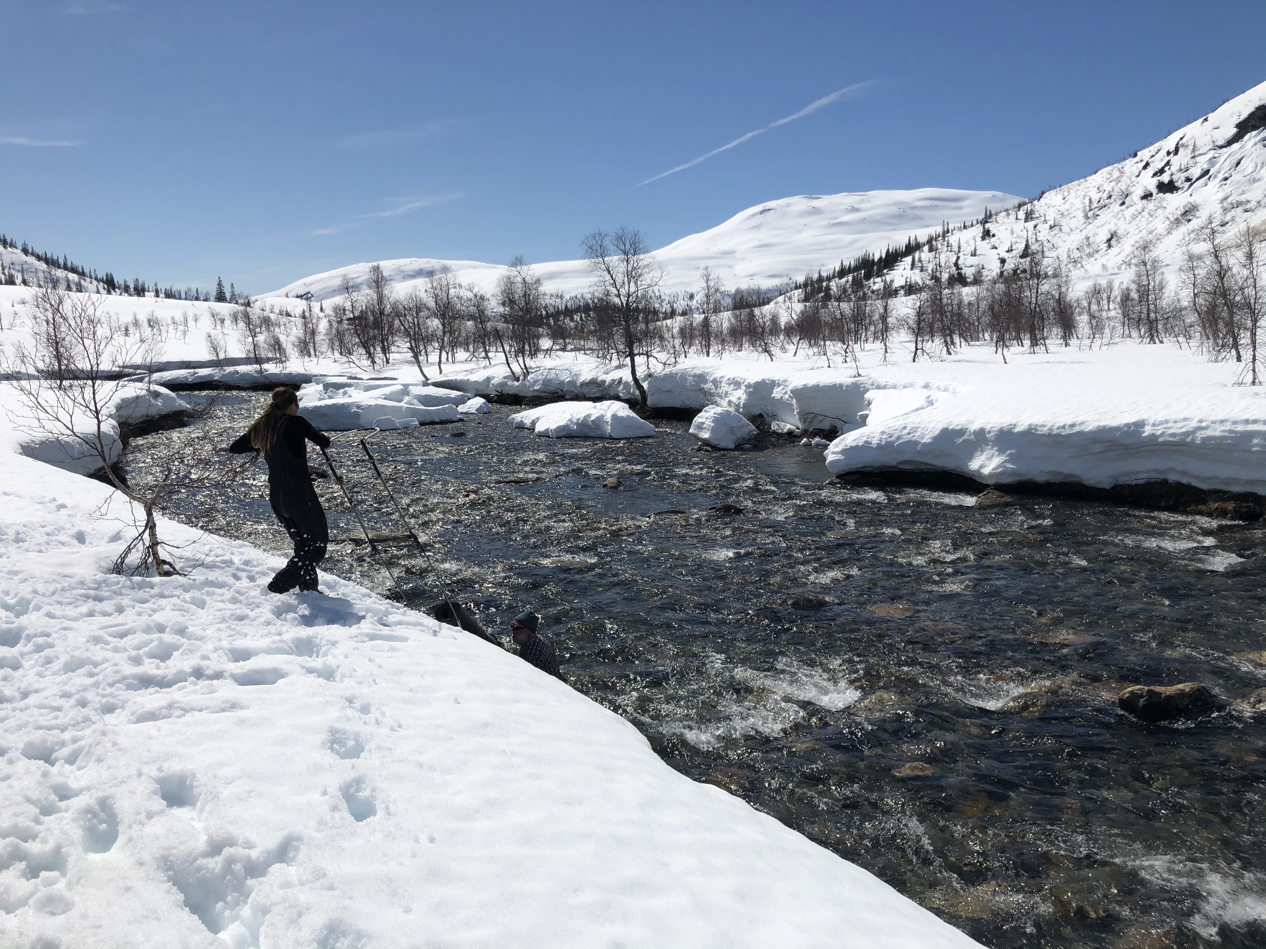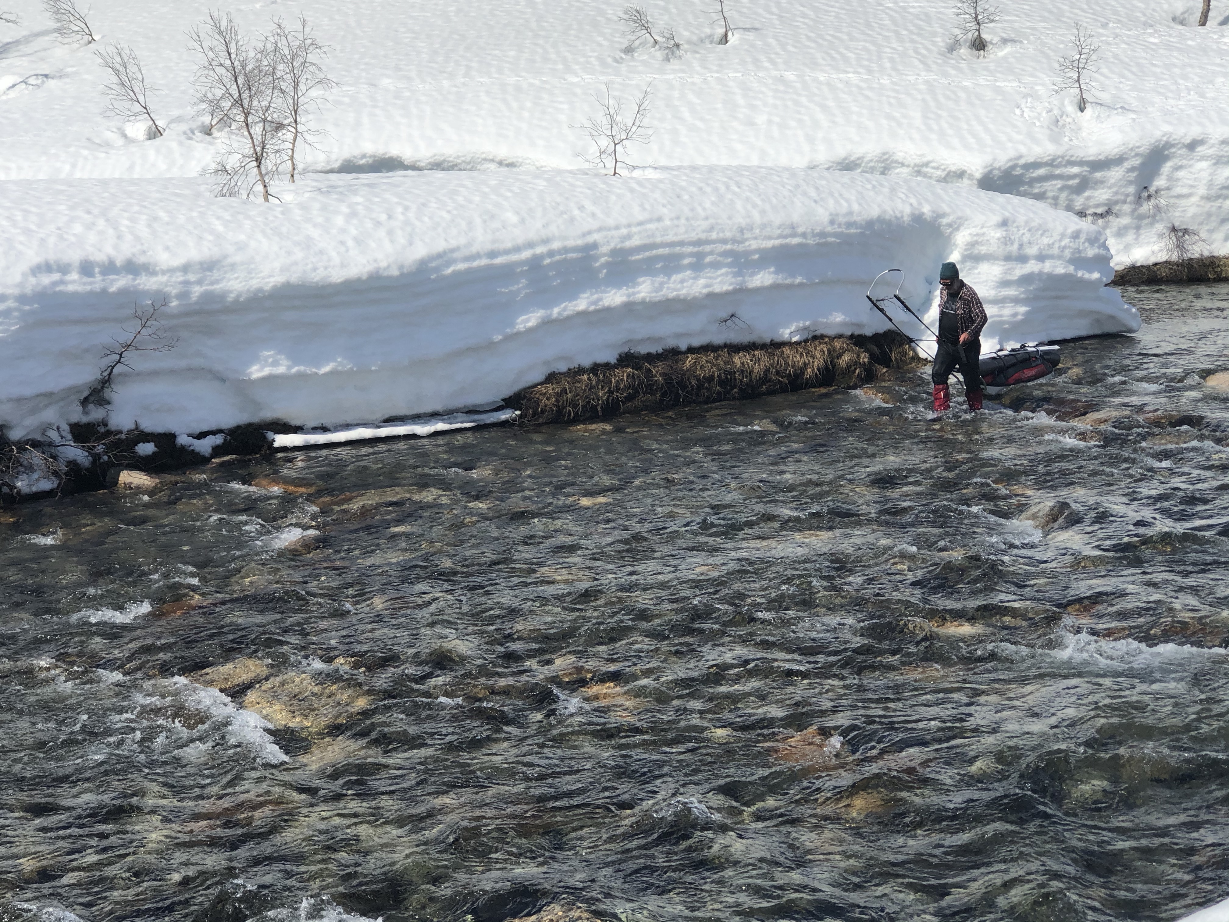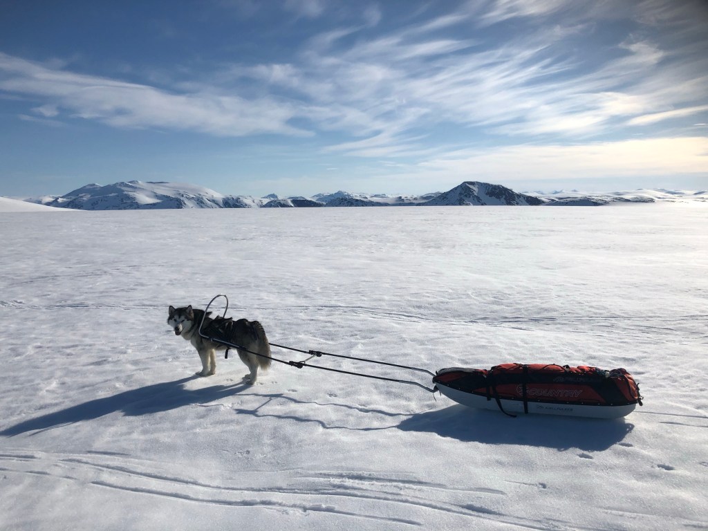Brundalselva var åpen så vi fikk en interessant opplevelse med å frakte pulker og hunder over elva. Nuuk skulle absolutt ikke være med ut i vannet, så det ble litt styr før vi fikk lempa han uti. Alle kom seg over elva, og etterhvert vel heim med uforglemmelige minner i bagasjen. Vårens absolutte høydepunkt.